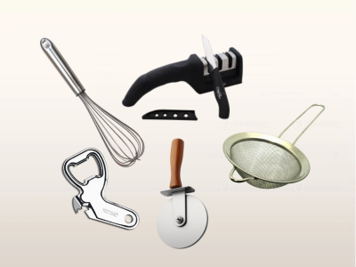 Kit abridor de latas, afiador, batedor de ovos, coadores e cortador de pizza
